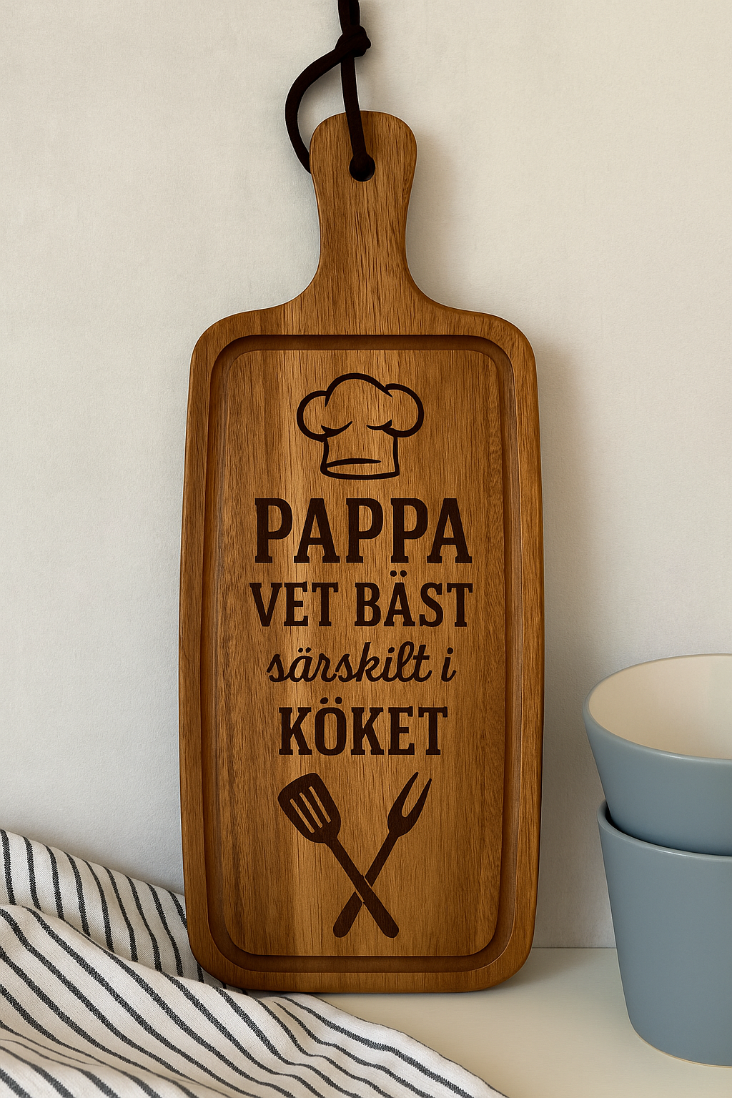 Denna serveringsbricka i akacia-trä kombinerar funktion med värme och kärlek. Med den ingraverade texten "Allt är bättre i mammas kök", eller ”Pappa vet bäst, särskilt i köket” blir den en fin present till mamma eller pappa – eller en fin detalj i det egna köket.