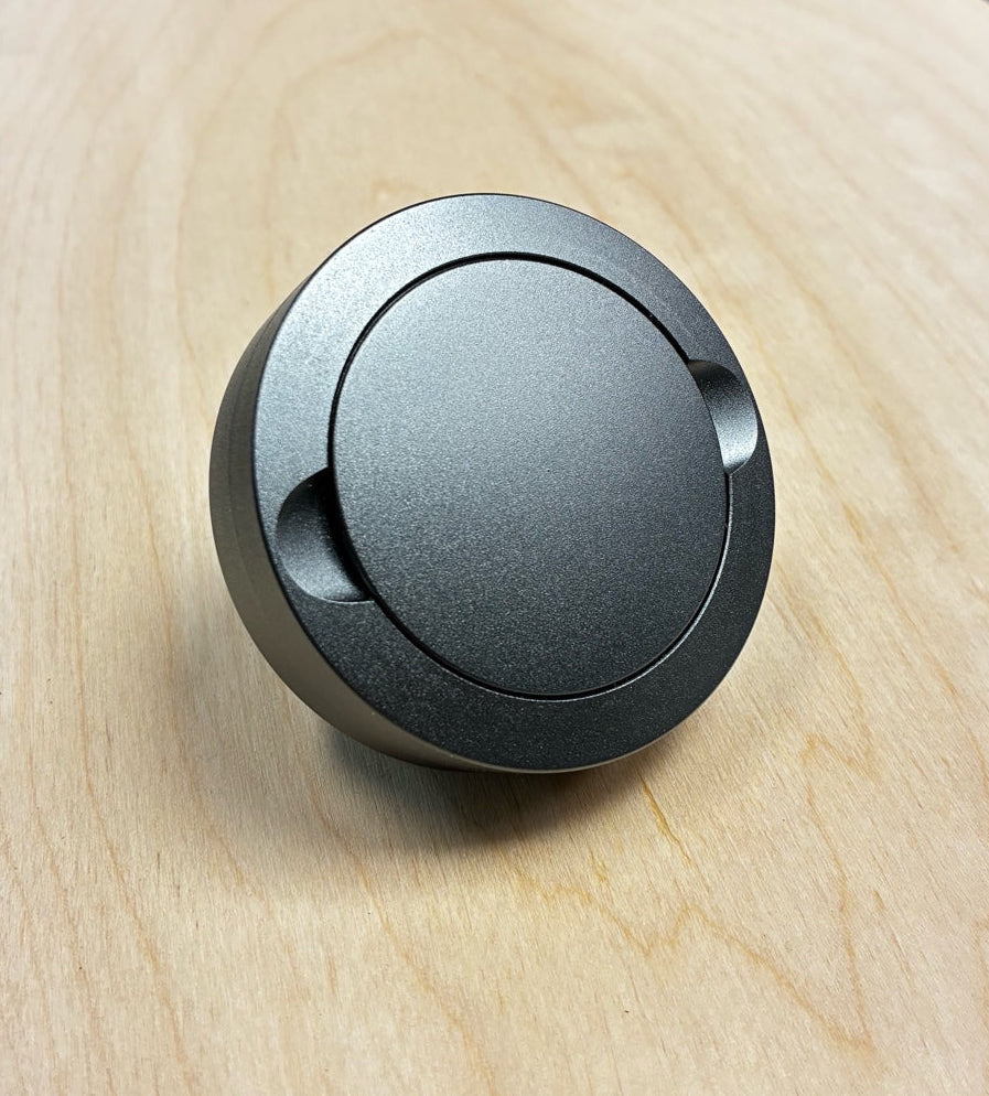 En elegant snusdosa i metall med dubbla lock och gummitätning i övre locket och gängat lock i det större.